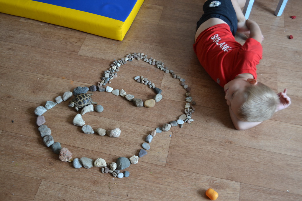 Пока Артур развлекался соединением камней, мы с Родионом из них складывали картинки. Стрелочку сам сделал Родиошка.